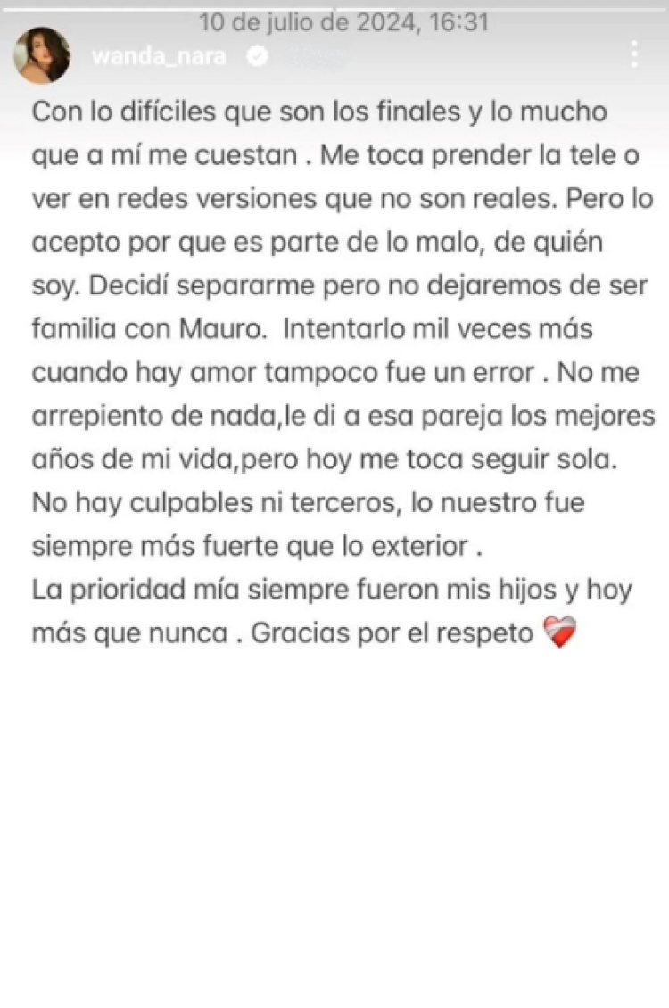 Wanda Nara, Instagram hesabından yaptığı paylaşımda şu ifadelere yer verdi: "Ayrılmaya karar verdim ama Mauro ile aile olmaktan vazgeçmeyeceğiz. Aşk varken daha fazlasını denemek hata değildi. Hiçbir şeyden pişman değilim, bu çifte hayatımın en güzel yıllarını verdim ama bugün yalnız kalmak zorundayım." Nara, ayrıca hiçbir suçlu veya üçüncü şahıs olmadığını, ilişkilerinin her zaman dışarıdan görünenden daha güçlü olduğunu belirtti. "Önceliğim her zaman çocuklarım oldu ve bugün her zamankinden daha fazla. Saygınız için teşekkürler." dedi.