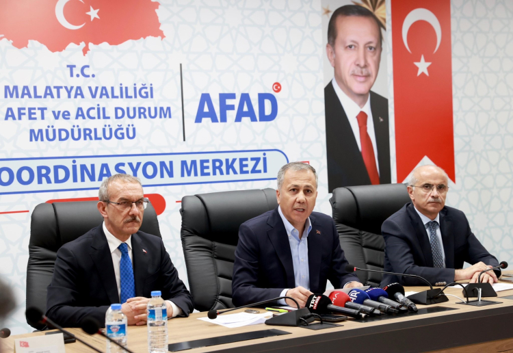 Depremin olduğu ilk andan itibaren çalışmalarını aralıksız sürdürdüklerini ve yerleşim yerlerinde tarama gerçekleştirdiklerini söyleyen İçişleri Bakanı Ali Yerlikaya, "Depremden Kahramanmaraş ve Tunceli illerimiz de etkilendi. Depremin olduğu ilk andan itibaren biz bu haber bize geldiği an AFAD Başkanlığımızdan 18 dakika sonra depremi merkez üssü az önce de ifade ettiğim gibi Malatya talep olduğunu ilk önce Cumhurbaşkanımıza bilgiyi arz ettik. Hemen süratle valilerimiz ile irtibata geçtik. Depremin hemen ardından Malatya Valimiz başta olmak tüm vali AFAD, jandarma, emniyet, büyükşehir ve il belediyeleri ilçe belediyeleri başta olmak üzere kamu kurum ve kuruluşları bir koordinasyon süreciyle birlikte ilgili yerleşim yerlerinde mahalleler köy köy saha taraması gerçekleştirdik” şeklinde konuştu.