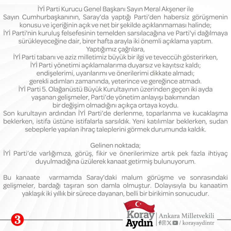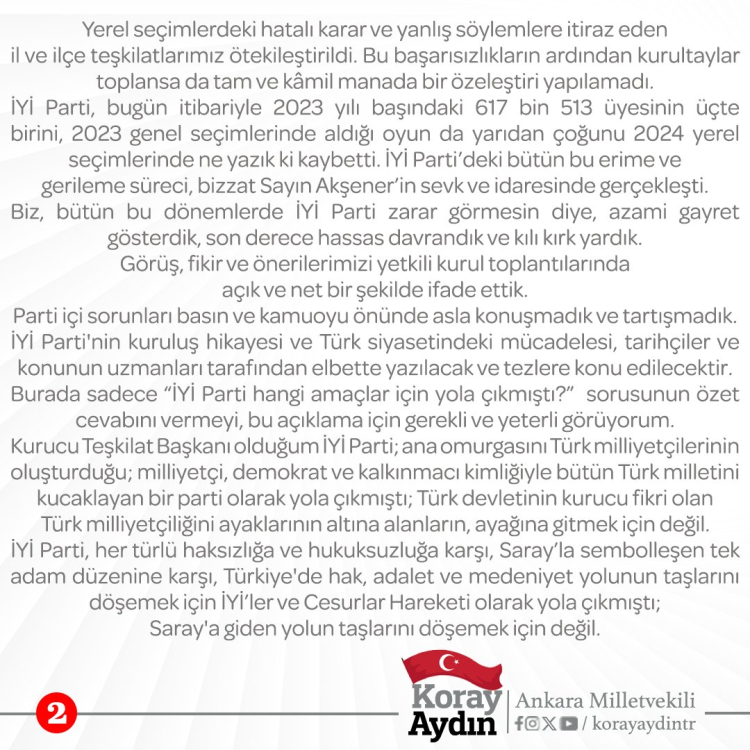 Koray Aydın, partide yaşanan erime ve gerileme sürecinin Meral Akşener’in sevk ve idaresinde gerçekleştiğini belirtti. Hatalı stratejilere ve kurultay sonrası yönetim anlayışında bir değişiklik göremediğine vurgu yaptı. Bayramda Dervişoğlu ile Akşener’in bir araya gelmesinden sonra kararını netleştirdiğini ifade eden Aydın, partideki muhalefetin ayrılmış göründüğünü belirtti.