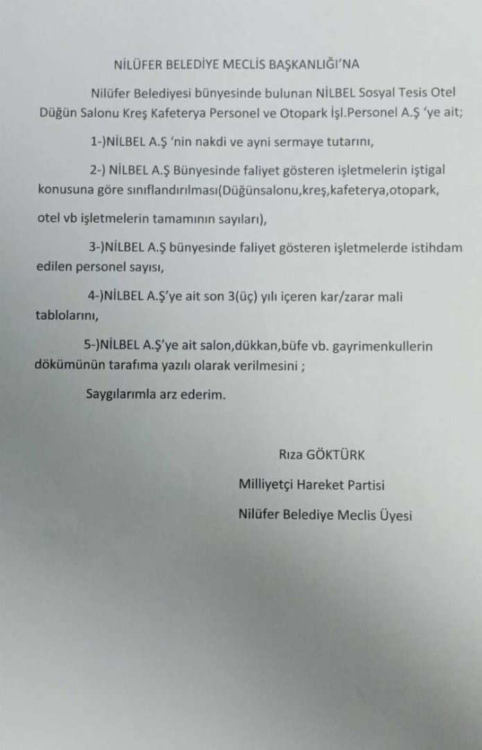 MHP Nilüfer Belediye Meclis Üyesi Rıza Göktürk, Nilüfer Belediyesi bünyesinde bulunan NİLBEL Sosyal Tesis, Otel, Düğün Salonu, Kafeterya, Kreş ve Otopark İşletmeleri Personel AŞ. hakkında soru önergesinde bulundu. 5 maddelik soru önergesi yönelten Göktürk, NİLBEL AŞ.’nin nakti ve sermaye durumu, faaliyet gösteren işletmelerin iştigal konusuna göre sınıflandırılması, istihdam edilen personel sayısı, son 3 yılı içeren kar/zarar mali tabloları ve gayrimenkullerin yazılı olarak sunulmasını istedi.