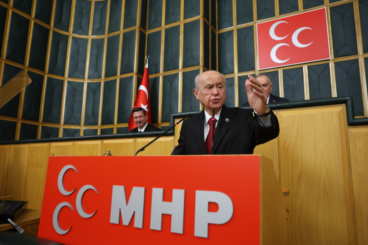 TBMM ile İmralı adasını egemenlik ölçeğinde ayırmak iflah olmaz bir ahmaklık olduğunu ifade eden Bahçeli, “Teröristbaşının, Türkiye Büyük Millet Meclisi DEM Parti grubuna gelmesine itiraz ediliyor da İmralı’da kalmasına niye tepki gösterilmiyor? Bu ne yaman bir çelişkidir? Bu nasıl bir izan eksikliğidir? Teröristbaşının tecridi kalkarsa, DEM Parti grubunda bölücü terör örgütünün eylemsel, pratiksel, amaçsal ve araçsal olarak bittiğini ve sonlandığını açıklamasından şimdiden rahatsızlık duyanlar, terörden geçinen, kandan nemalanan köksüzlerden başkası olmaz, olamaz. Ceset edebiyatı yapanlar, eğer kendilerine güveniyorlarsa, buyursunlar terörle mücadele maksadıyla Mehmetlerimizin yanına gitsinler, dağın başında nöbete girsinler, o zaman göreyim alayının ense tıraşını. Diyorlar ki, yeni anayasa hazırlık süreci için tahkimat yapıyormuşuz. Diyorlar ki, Sayın Cumhurbaşkanımızı bir kez daha seçtirmek için yol arıyormuşuz” şeklinde konuştu.