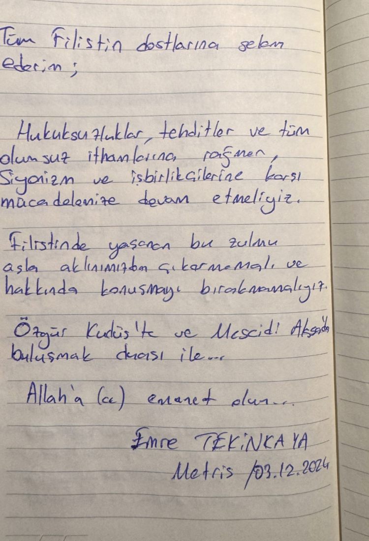 Yeniden Refah Partisi'nin paylaştığı not, partinin sosyal medya hesaplarında geniş bir yankı uyandırırken, Filistin destekçileri tarafından olumlu yorumlarla karşılandı. Partililer, Tekinkaya’nın cezaevinden gönderdiği mesajların, hem şahsi hem de toplumsal anlamda büyük bir önem taşıdığına dikkat çekti.