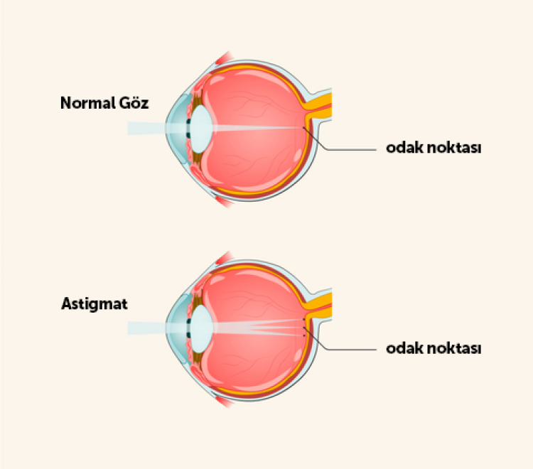 Astigmat, korneanın veya göz merceğinin düzensiz şekli nedeniyle ışığın retina üzerinde düzgün bir şekilde odaklanamaması durumudur. Bu bozukluk, hem uzak hem de yakın mesafedeki nesnelerin bulanık görülmesine neden olabilir.
