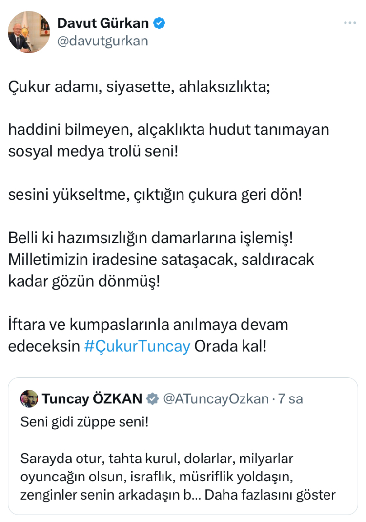 Başkan Gürkan sosyal medya hesabından yaptığı paylaşımda, "Çukur adamı, siyasette, ahlaksızlıkta;