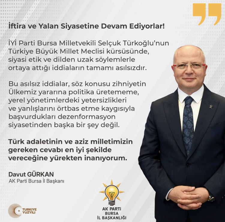 Ak Parti Bursa İl Başkanı Davut Gürkan, İYİ Parti Bursa Milletvekili Selçuk Türkoğlu'nun açıklamaları ile ilgili bir açıklama yaptı.