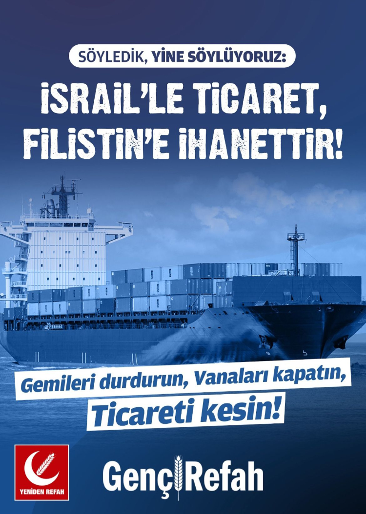 Yeniden Refah Partisi Gençlik Kolları, Hükümet’in İsrail’le ticarete devam ettiğini iddia ederek sosyal medyada kamuoyu oluşturdu.