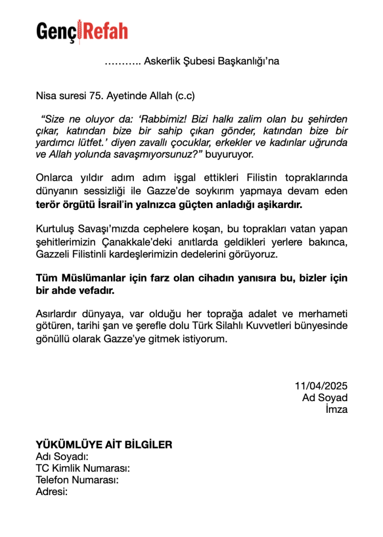 Gençlik Teşkilatları, bu hafta Cuma namazı sonrası, ülke genelinde il ve ilçe askerlik şubelerine giderek "Türk Silahlı Kuvvetleri bünyesinde gönüllü olarak Gazze’ye gitmek için" dilekçe vereceklerini açıkladı.