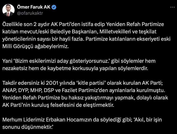 Yeniden Refah Partisi Genel Merkez Mahalli İdareler Başkan Yardımcısı Ömer Faruk Ak, AK Parti'de daha önce belediye başkanlığı ve milletvekilliği yapmış bir çok ismin Yeniden Refah Partisi'ne geçip adaylık başvurusu yapmasının konuşulması üzerine sosyal medya hesabından bir açıklama yaptı. Ömer Faruk Ak, resmi sosyal medya hesabı üzerinden yaptığı açıklamada net konuştu.