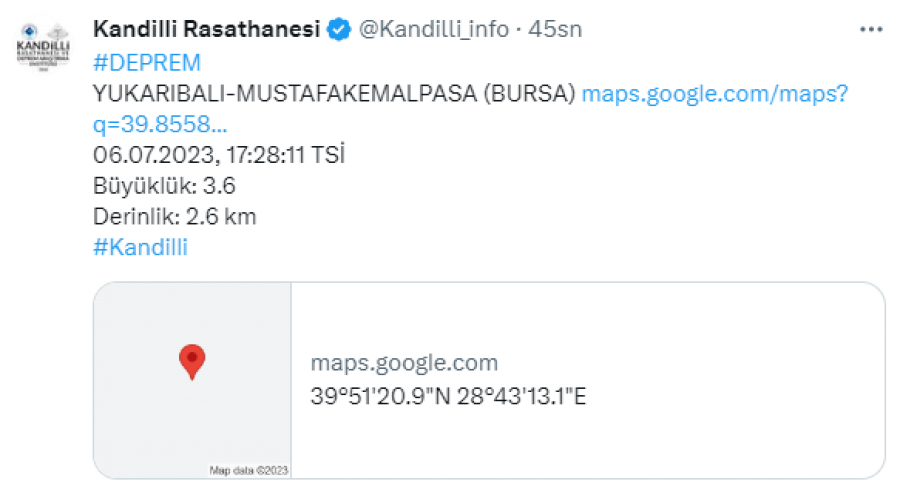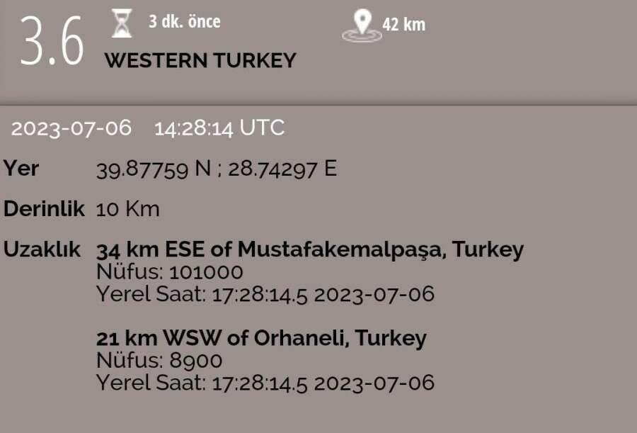 Bursa'nın Orhaneli ilçesinde 3.6 büyüklüğünde deprem meydana geldi.