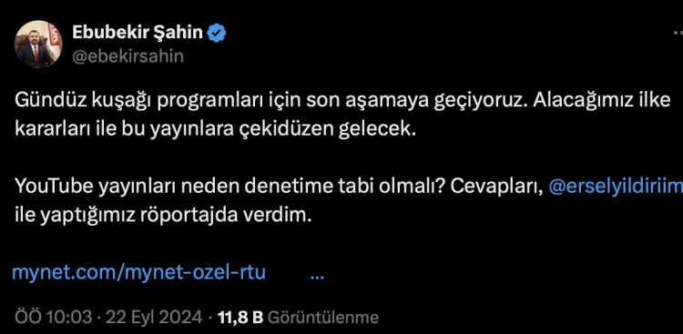 Çok yakında Üst Kurula sunarak uygulamaya alacağız. Amacına hizmet etmeyen, kalitesiz gündüz kuşağı yayınları için son önlemimiz olan ilke kararlarını alıp kararlı bir şekilde gerekli adımları en sert şekilde atacağız."