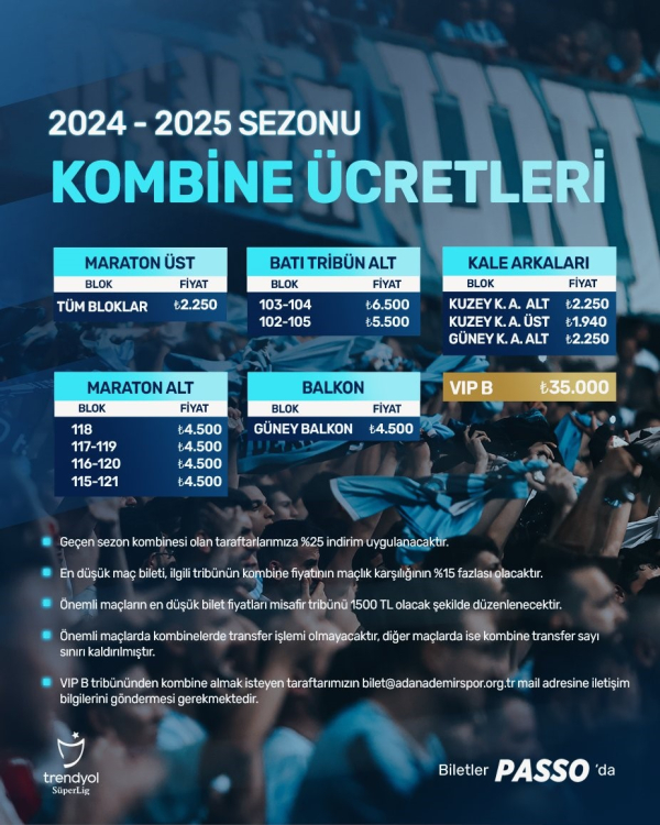 Mavi-lacivertli ekipten yapılan açıklamada, “ Büyük Adana Demirspor taraftarı, maçbiletlerine oranla çok daha avantajlı olan kombine biletlerinizi almak ve takımınıza destek olmak için söz sizde! Kombine satışlarımıza gelen yoğun talep doğrultusunda 15 Temmuz saat 23.59’a kadar kombine satışımız devam edecek. 16 Temmuz-31 Temmuz arasında kombinelerimiz %20 zamlı şekilde satışta olacaktır” denildi.