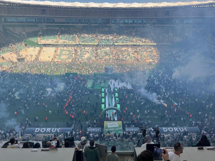 Kupa töreni sırasında binlerce taraftar sahaya inince görüntüler Bursaspor'un Süper Lig şampiyonluğunu akıllara getirdi.