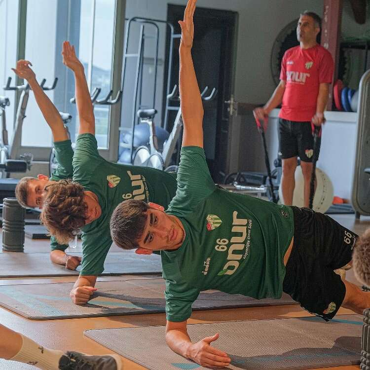 Teknik Sorumlu Murat Sözkesen gözetiminde gerçekleştirilen idmanda futbolcular, salonda kuvvet çalışmaları yaptı.