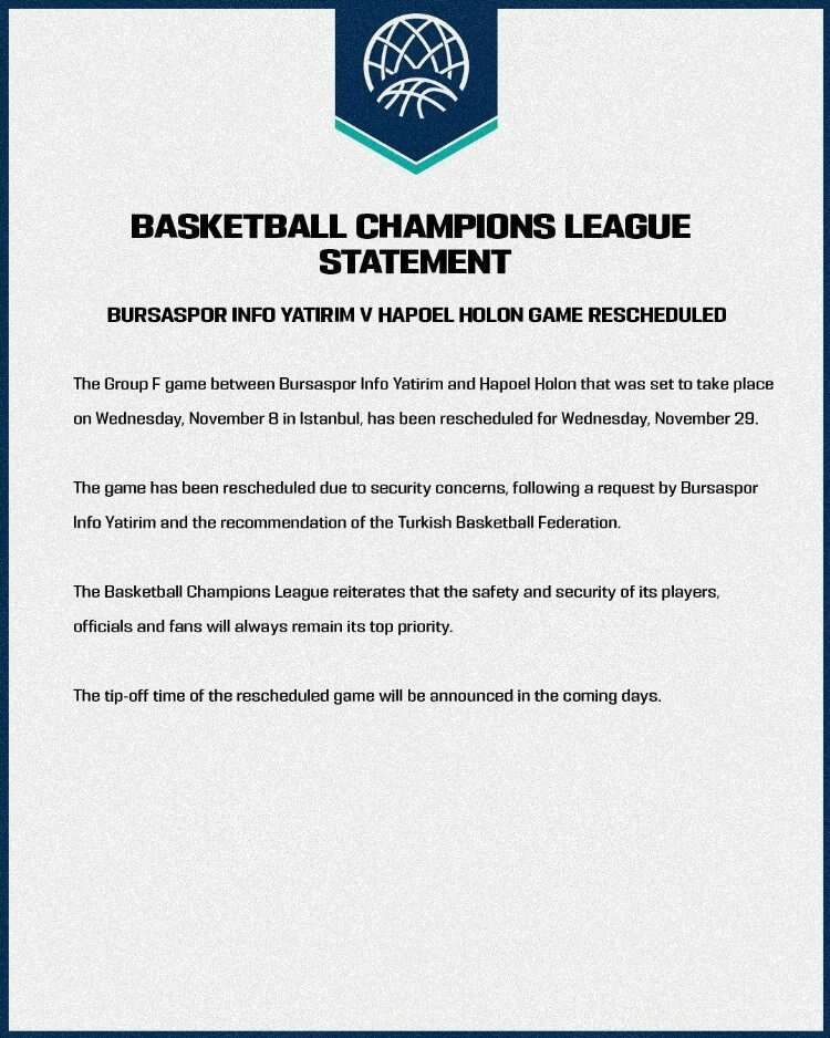 Basketbol Şampiyonlar Ligi’nde çarşamba günü oynanacak olan Bursaspor İnfo Yatırım - Hapoel Holon müsabakası, güvenlik sebepleri nedeniyle 29 Kasım Çarşamba gününe ertelendi.