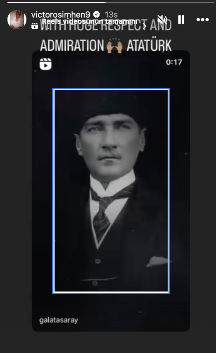 Galatasaray'ın Nijeryalı futbolcusu Victor Osimhen, Mustafa Kemal Atatürk'ün vefatının 86. yıldönümü nedeniyle sosyal medya hesabından paylaşımda bulundu.