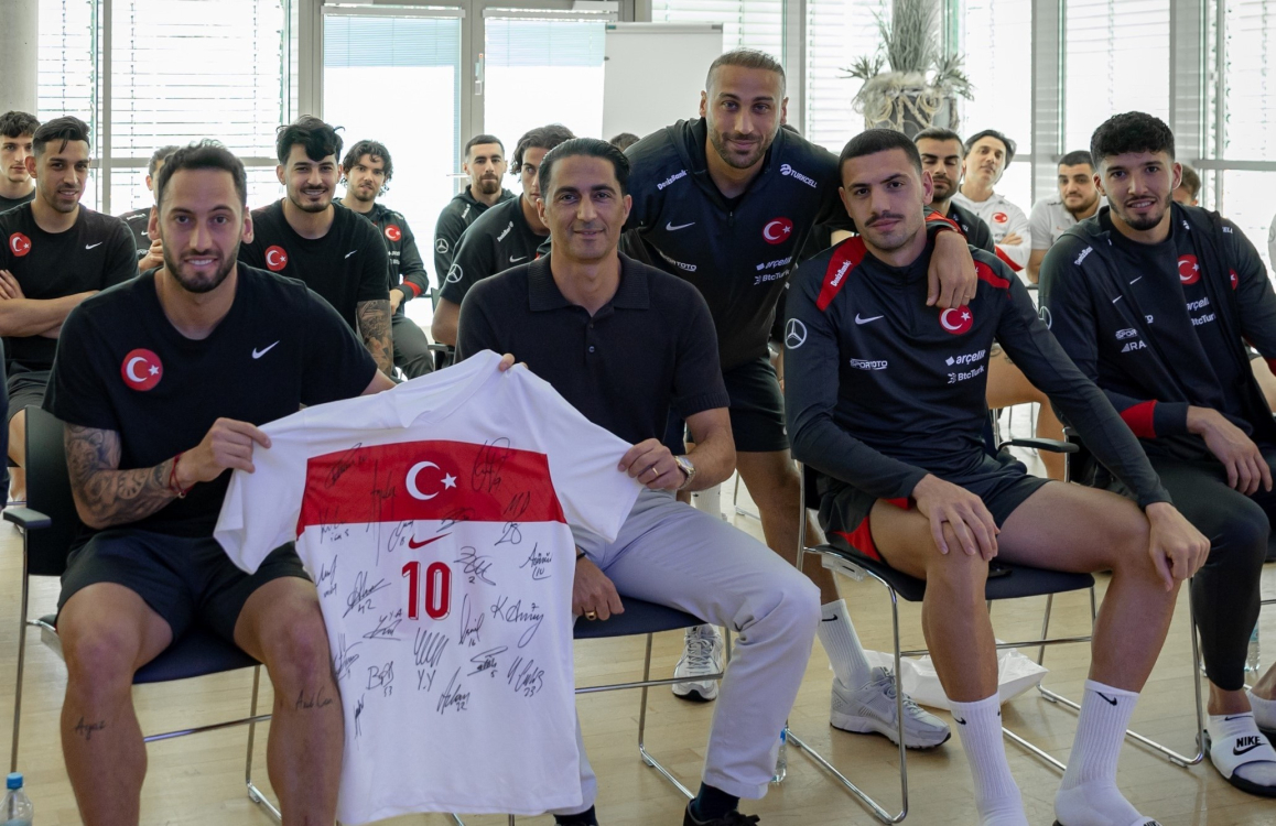 Takım kaptanı Hakan Çalhanoğlu, sunumun ardından Gözübüyük'e A Milli Takım oyuncularının imzaladığı bir forma hediye etti.