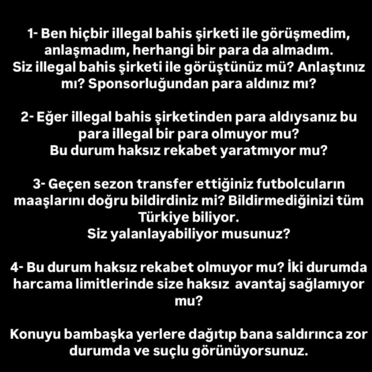 1- Ben hiçbir illegal bahis şirketi ile görüşmedim, anlaşmadım, herhangi bir para da almadım. Siz illegal bahis şirketi ile görüştünüz mü? Anlaştınız mı? Sponsorluğundan para aldınız mı?