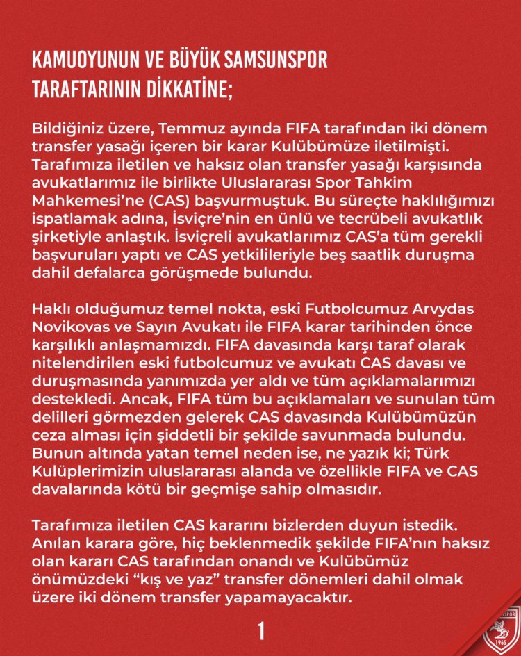 "Bildiğiniz üzere, Temmuz ayında FIFA tarafından iki dönem transfer yasağı içeren bir karar Kulübümüze iletilmişti. Tarafımıza iletilen ve haksız olan transfer yasağı karşısında avukatlarımız ile birlikte Uluslararası Spor Tahkim Mahkemesi'ne (CAS) başvurmuştuk. Bu süreçte haklılığımızı ispatlamak adına, İsviçre'nin en ünlü ve tecrübeli avukatlık şirketiyle anlaştık. İsviçreli avukatlarımız CAS'a tüm gerekli başvuruları yaptı ve CAS yetkilileriyle beş saatlik duruşma dahil defalarca görüşmede bulundu.