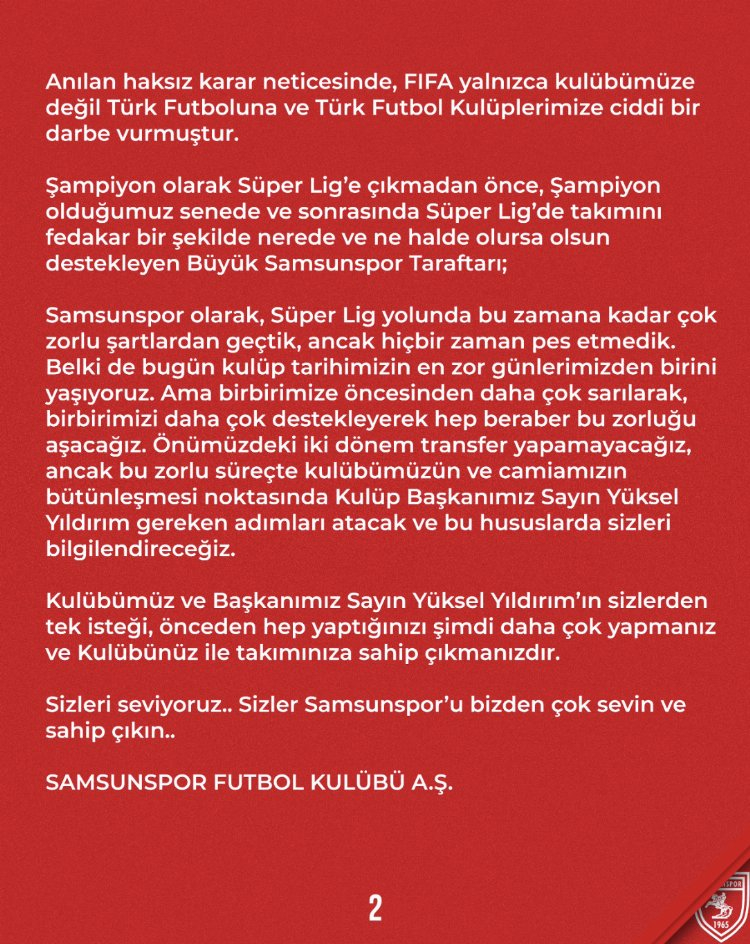 Samsunspor olarak, Süper Lig yolunda bu zamana kadar çok zorlu şartlardan geçtik, ancak hiçbir zaman pes etmedik. Belki de bugün kulüp tarihimizin en zor günlerimizden birini yaşıyoruz. Ama birbirimize öncesinden daha çok sarılarak, birbirimizi daha çok destekleyerek hep beraber bu zorluğu aşacağız. Önümüzdeki iki dönem transfer yapamayacağız, ancak bu zorlu süreçte kulübümüzün ve camiamızın bütünleşmesi noktasında Kulüp Başkanımız Sayın Yüksel Yıldırım gereken adımları atacak ve bu hususlarda sizleri bilgilendireceğiz.