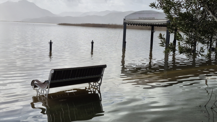 Muğla’nın Köyceğiz ilçesinde son günlerde etkili olan yoğun yağış ve kuvvetli lodos, Köyceğiz Gölü’nde su seviyesinin yükselmesine yol açtı. Gölün taşması sonucu kıyı kesimlerinde su baskınları yaşandı.Göl kenarındaki yürüyüş yolu ile bazı işletmelere ait masa ve sandalyeler sular altında kaldı. Su taşkını nedeniyle göl çevresindeki bazı yollar trafiğe kapatıldı ve araç geçişine izin verilmedi.