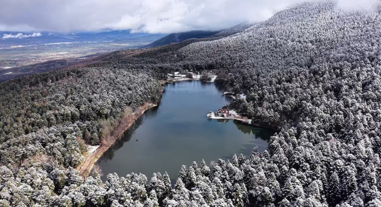 Dron ile havadan kaydedilen görüntülerde, karla örtülü ağaçlar, gölet çevresi ve Devlet Konukevi’nin beyaz örtüyle uyumu dikkat çekti.