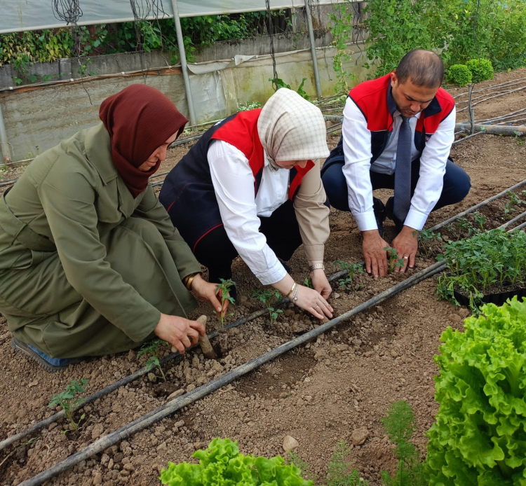 Tarım ve Orman Müdürü Esra Uzun tarlaya girdi kadın çiftçilerle fide dikti.