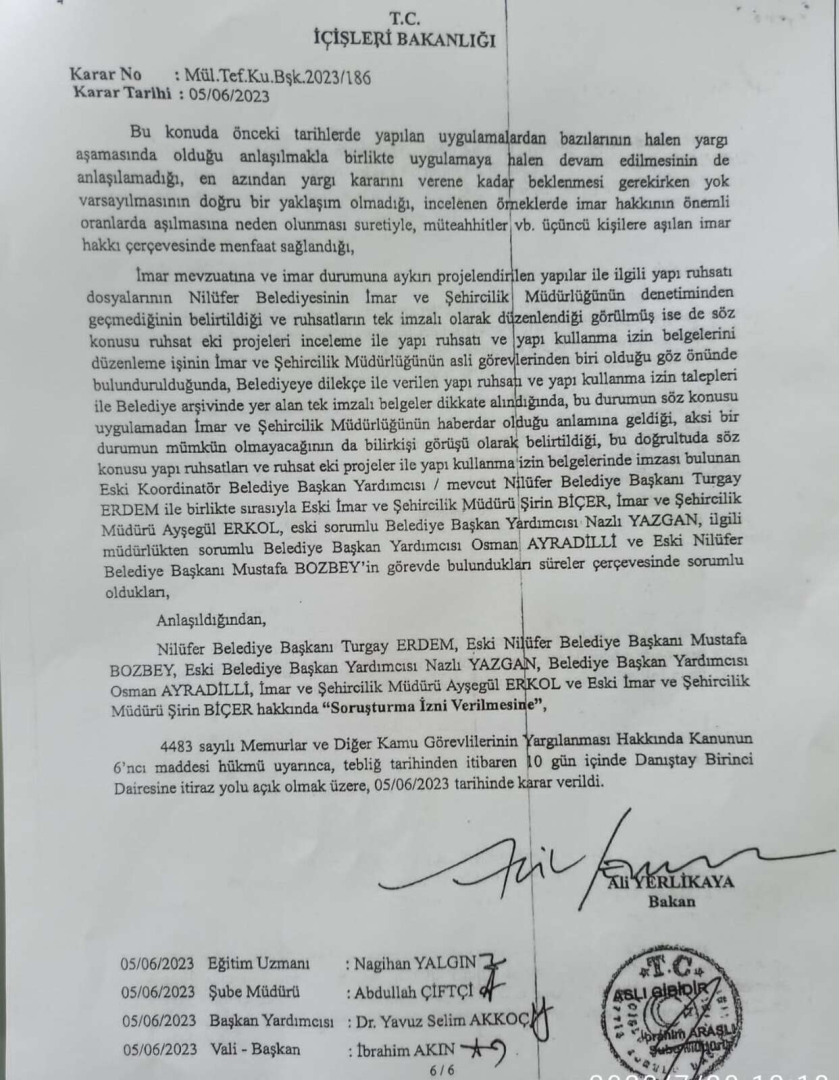 İçişleri Bakanı Ali Yerlikaya'da Cumhuriyet Savcısı'nın talebine 05.06.2023 tarihinde talebin "uygun" olduğunu gösteren altında imzasının bulunduğu evrağı Bursa Adliyesi'ne gönderilmiş.