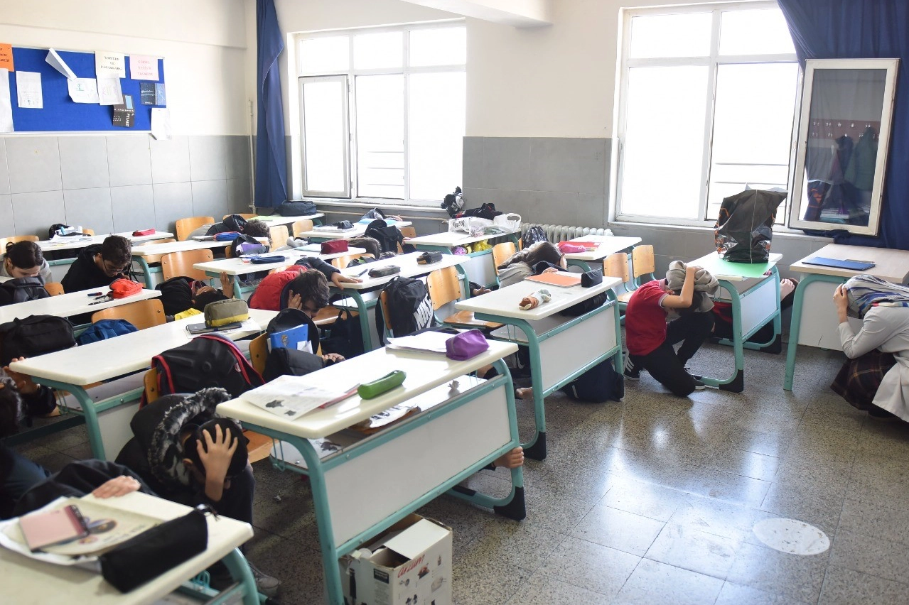 Öğretim yılı başından itibaren 9 okulda yaklaşık 3 bin 450 öğrenci ve öğretmene eğitim veren Afet İşleri Müdürlüğü ekipleri, Peyami Safa Ortaokulu öğrenci ve öğretmenlerine çök-kapan-tutun hareketi, okuldan güvenli tahliye, afet toplanma alanı, deprem anında ve sonrasında doğru hareket etme yöntemleri konularında teorik ve uygulamalı eğitim verdi.